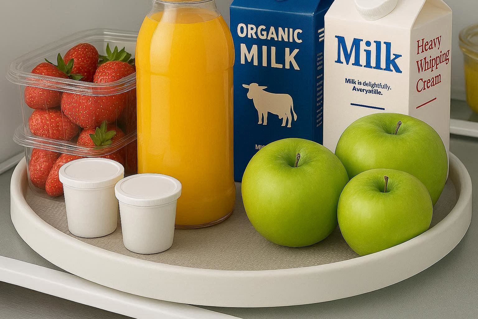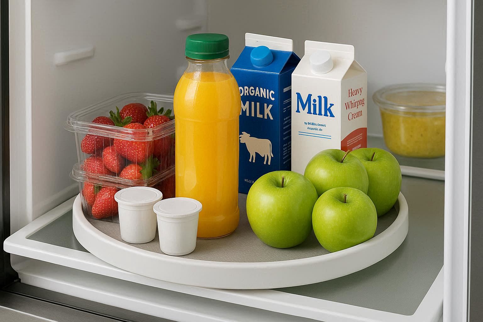Available in various diameters to fit standard fridge depths, it provides a stable platform for jars, bottles, condiments, yogurt cups, and small containers. Using this turntable eliminates the “black hole” effect at the back of your fridge, where items are forgotten and spoil. It is easy to clean and can also be used in pantry cabinets.